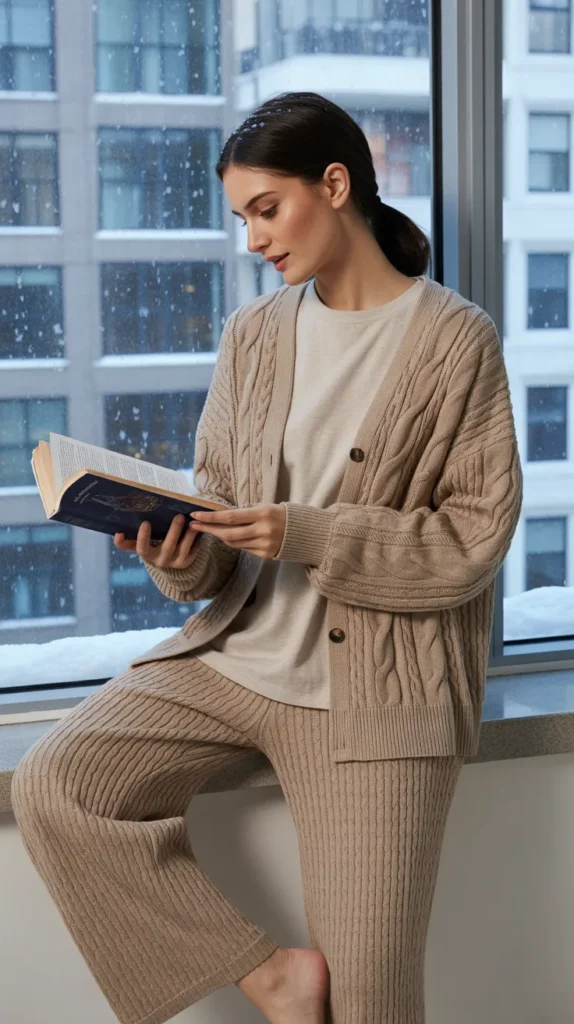 A cable-knit cardigan, cotton tee, and lounge pants create the perfect at-home winter vibe. It’s simple, warm, and ideal for movie nights, slow mornings, or cozy work-from-home days proof that comfort doesn’t have to mean sloppy.