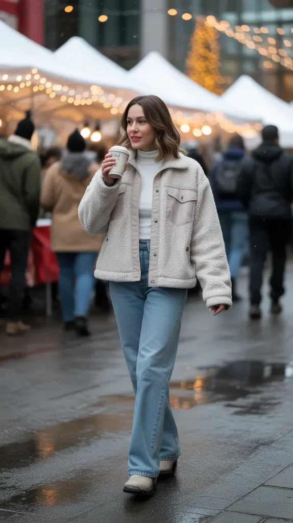Nothing says winter like a sherpa jacket over a thermal top and straight jeans. It’s plush, practical, and perfectly trendy. Add your favorite boots or sneakers, and this comfy winter outfit becomes your go-to for everyday errands or chilly weekend outings.