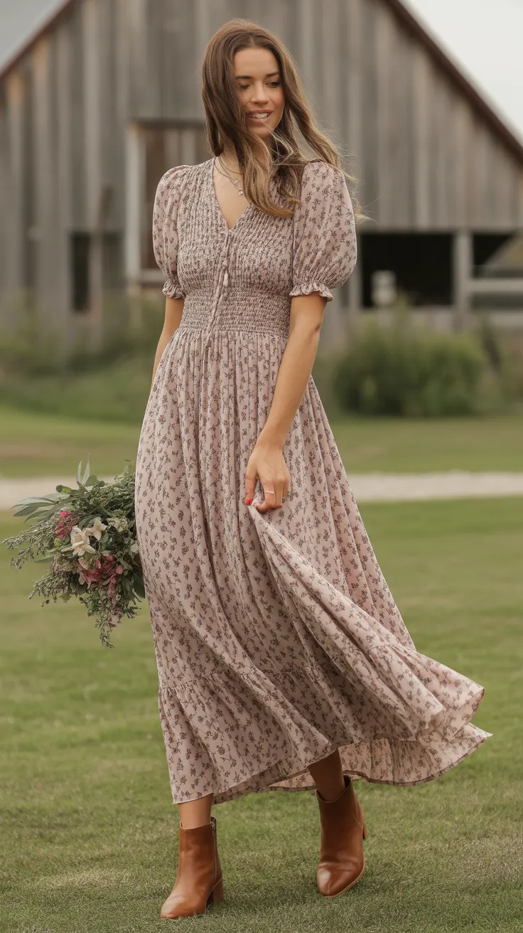 Pairing the dress with brown cowboy boots brings in that southern charm. This look is ideal for a barn wedding, where you want to feel both dressy and relaxed. The boots add a fun twist, making it a standout choice among dressy country outfits.