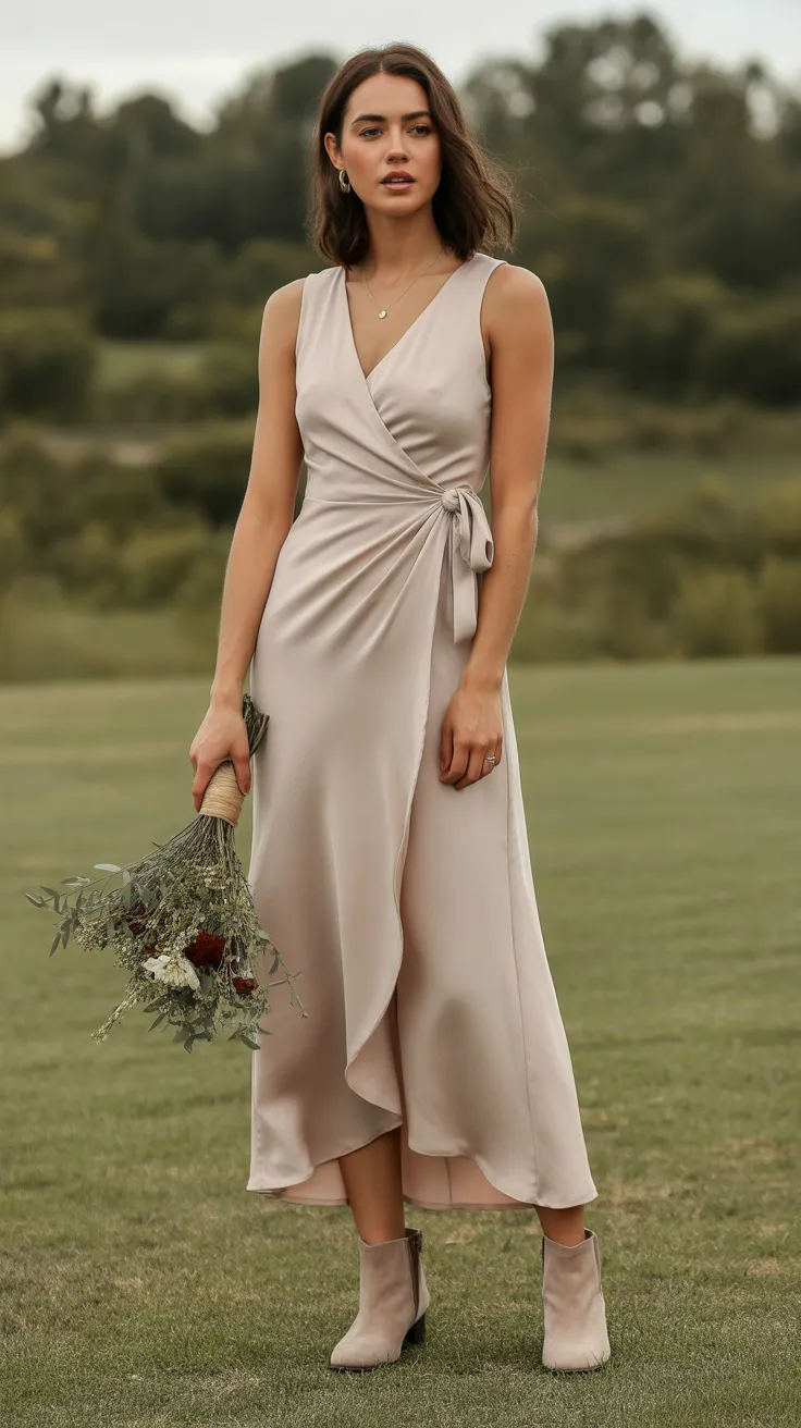 10. Sleeveless Wrap Wedding Guest Dress With Booties