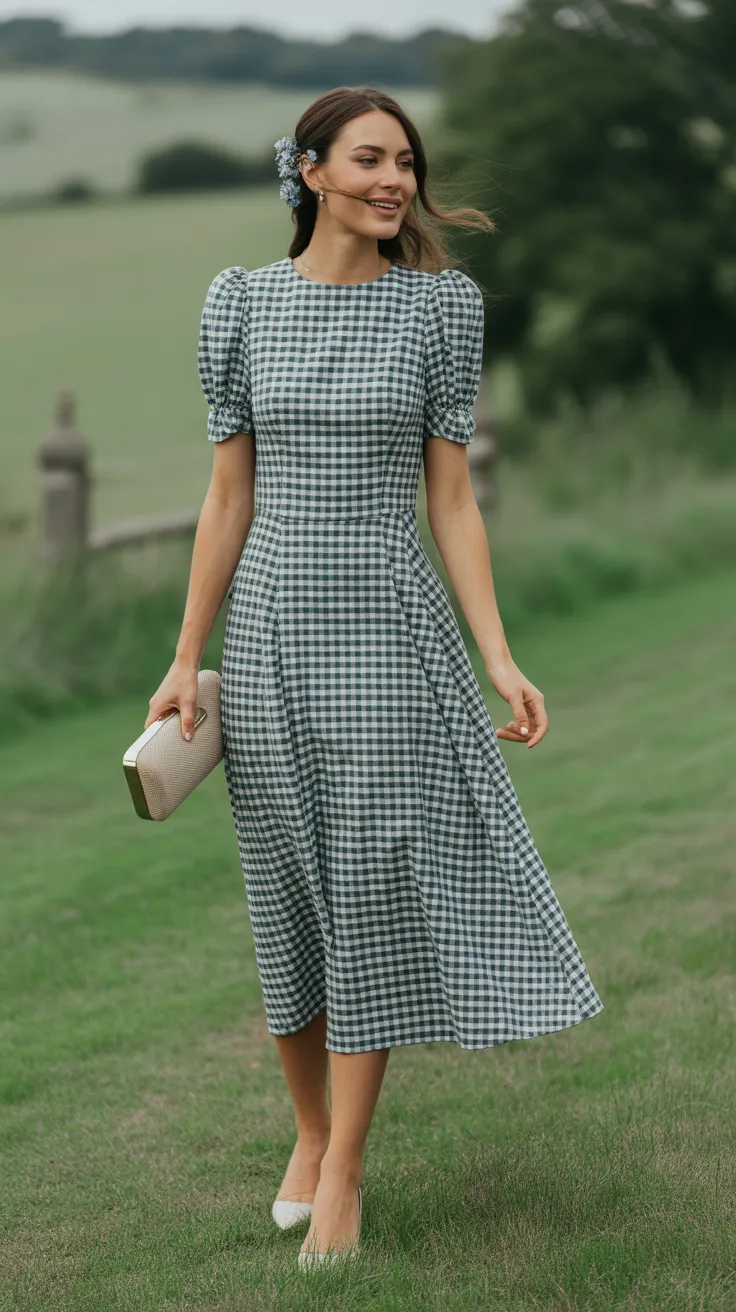 The gingham midi dress is a perfect choice for a country wedding guest outfit. Its classic check pattern brings a touch of rustic charm that fits right in at a barn wedding. The dress features a fitted bodice and a flowing skirt, making it both comfortable and stylish.