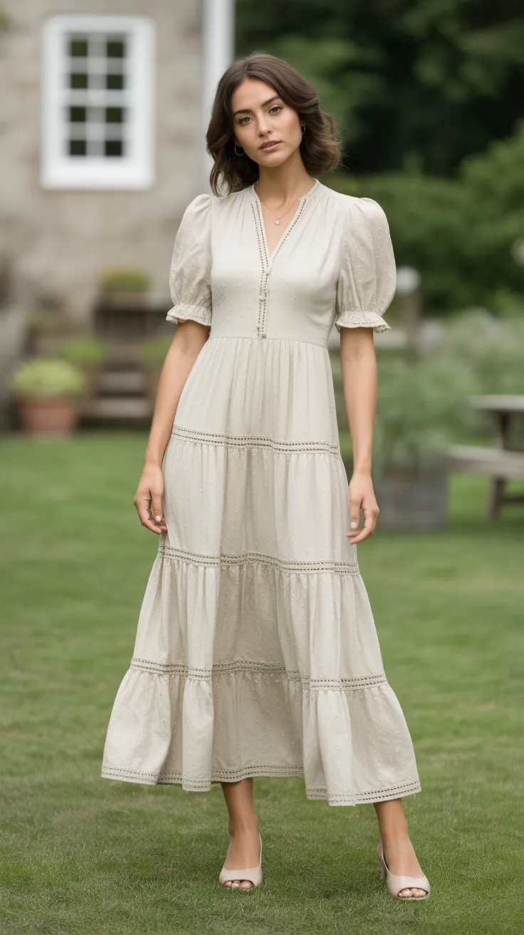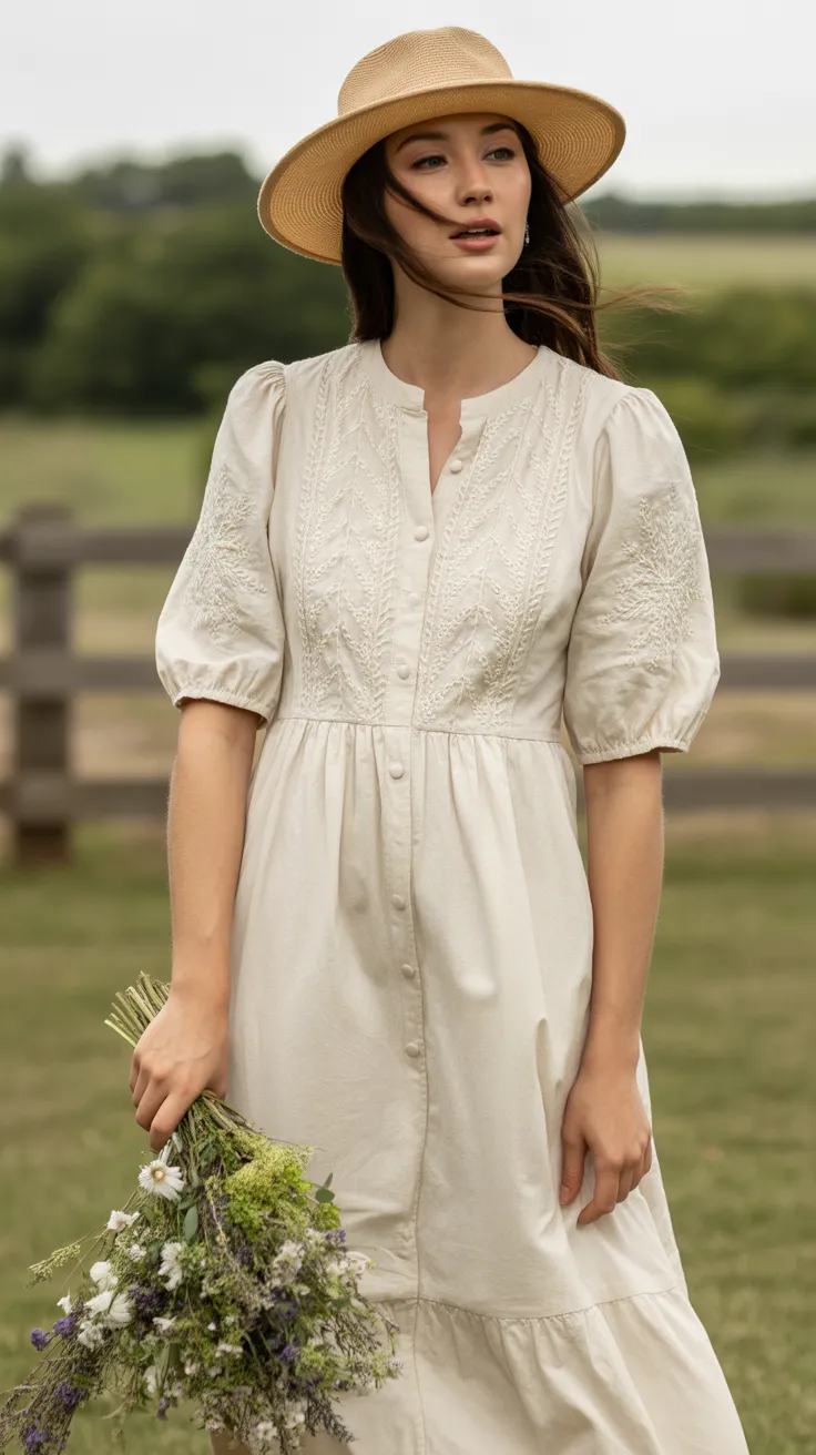 Accessorizing with simple jewelry enhances the feminine style without overwhelming the rustic aesthetic. This dress is versatile enough for various outdoor settings, making it one of the best dressy country outfits you can choose for a wedding.