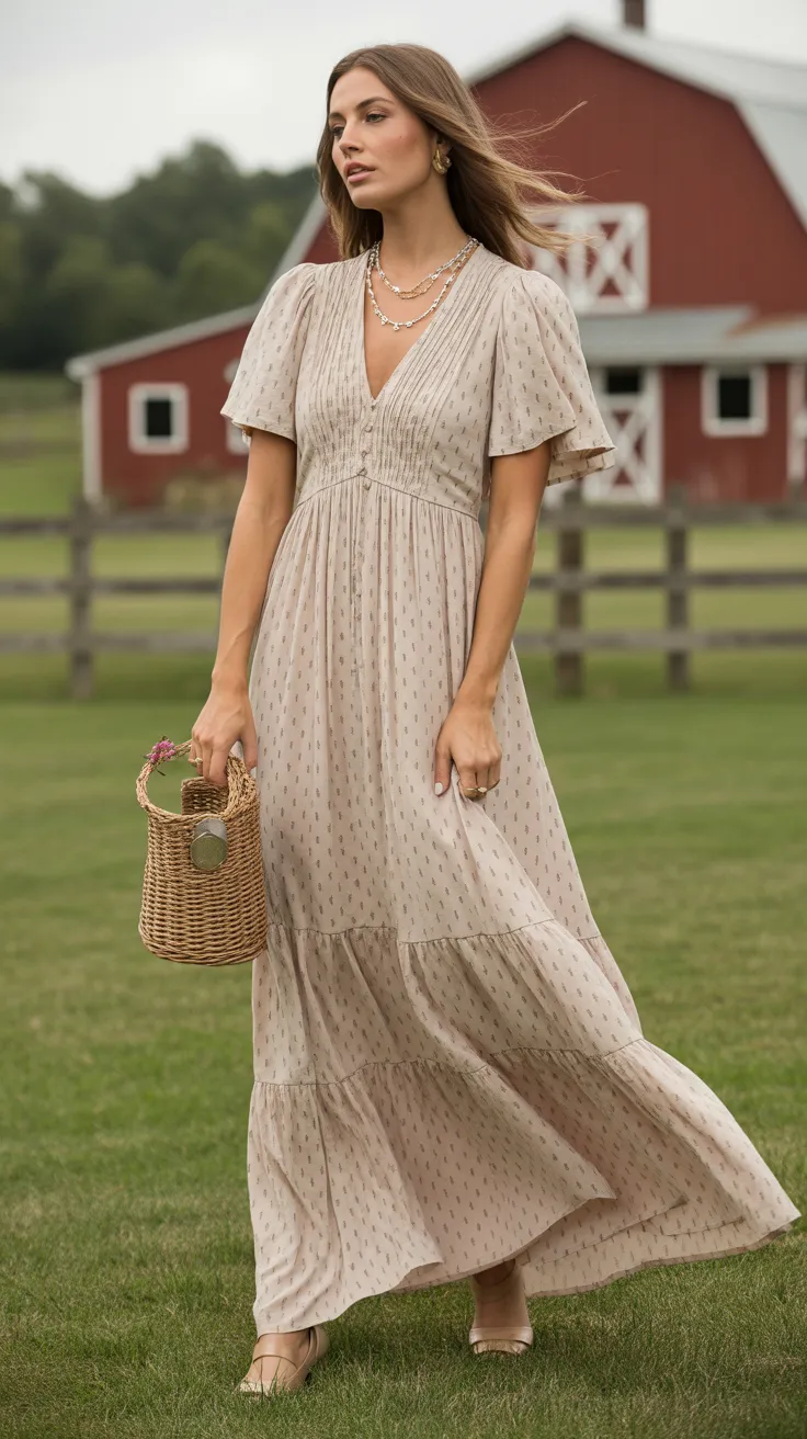 Pairing the dress with a stylish straw hat elevates the look. The hat not only protects from the sun but also adds a rustic charm that fits right in at a barn wedding. This outfit strikes a balance between dressy and casual, making it a great pick for any rustic wedding outfit guest.