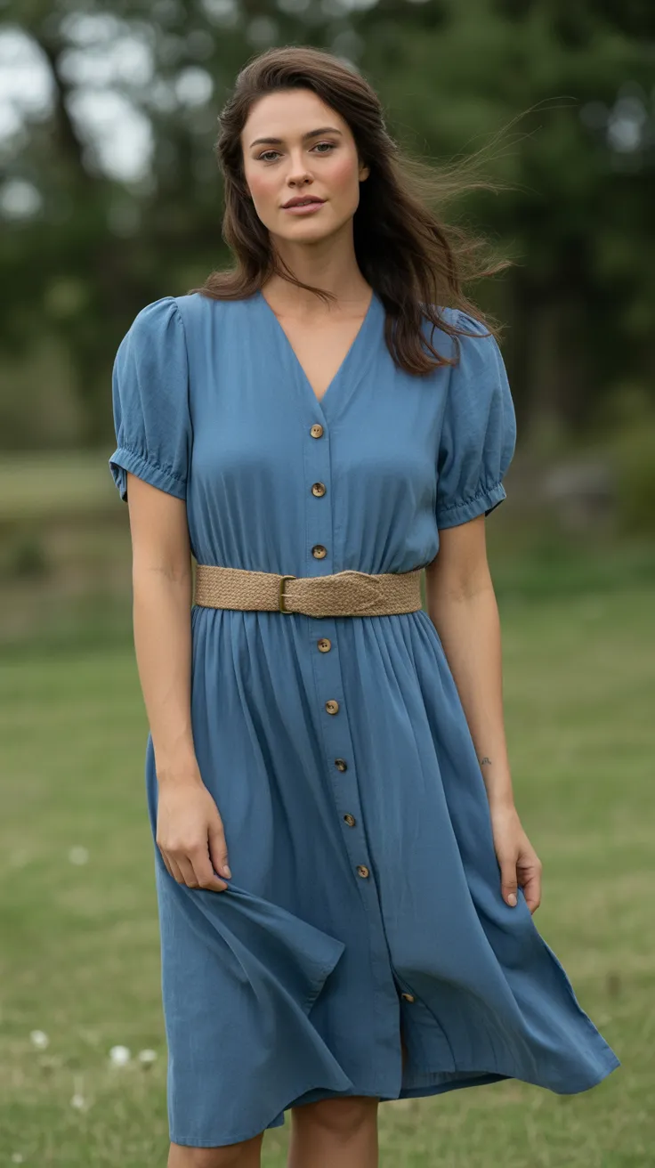 This button-up blue dress is a lovely choice for a country wedding. The soft blue color gives it a fresh and airy feel, perfect for an outdoor setting. The woven belt adds a nice touch, cinching the waist and creating a flattering silhouette.