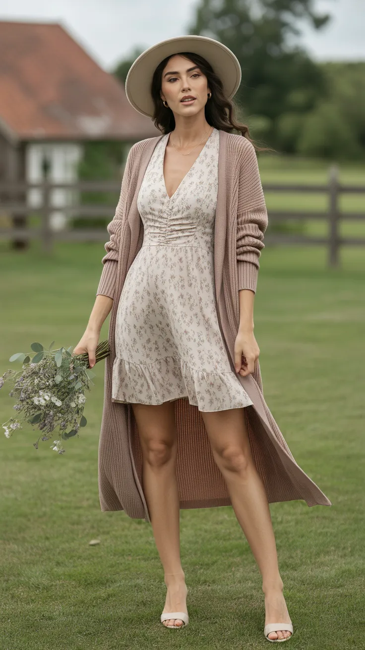The long cardigan adds warmth and style, making it suitable for cooler evenings. It’s a cozy layer that complements the dress without overpowering it. This combination is ideal for a barn wedding or any outdoor celebration.