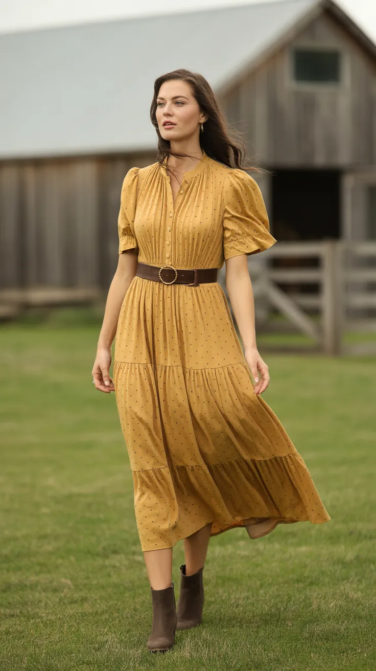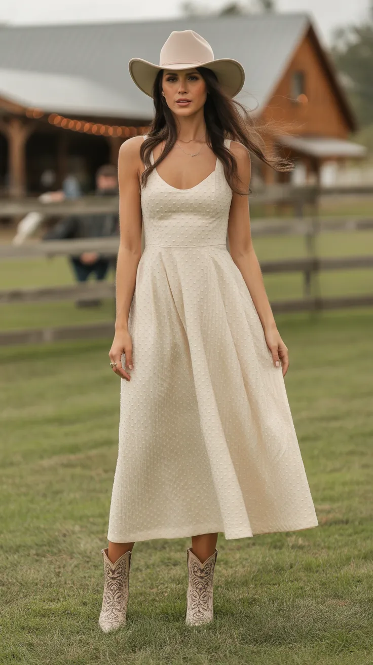 Pairing the dress with brown cowboy boots brings in that southern charm. This look is ideal for a barn wedding, where you want to feel both dressy and relaxed. The boots add a fun twist, making it a standout choice among dressy country outfits.