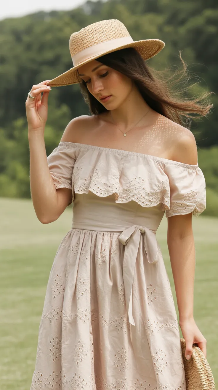 2. Off-Shoulder Eyelet Wedding Guest Dress With Straw Hat