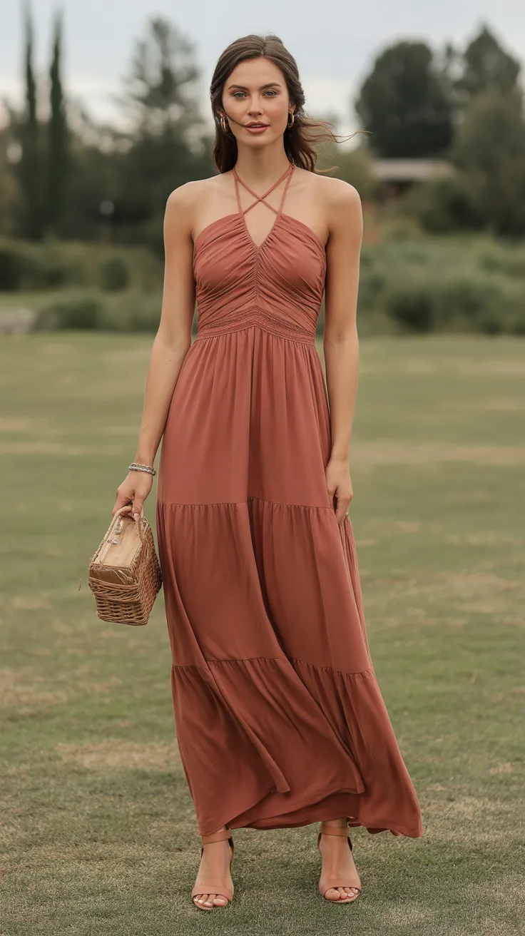 The terracotta halter maxi dress is a stunning choice for a rustic wedding outfit guest. Its warm, earthy tone perfectly complements the natural surroundings of a country setting. The halter neckline adds a touch of femininity, while the flowing maxi length keeps it comfortable and stylish.