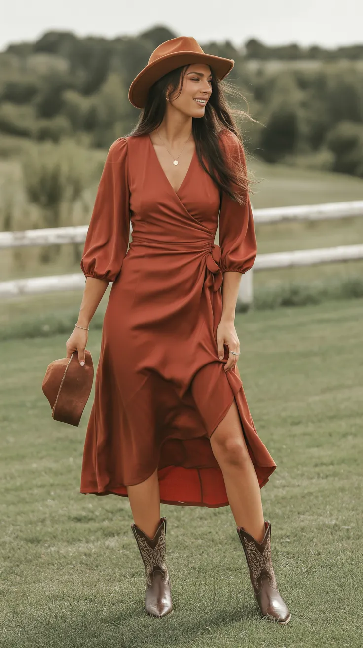 Picture this: a stunning rust midi wrap dress paired with stylish cowboy boots. This outfit perfectly captures the essence of southern cute outfits while remaining chic and comfortable for any country wedding. The wrap style flatters various body types, making it a great choice for wedding guests looking to blend rustic charm with feminine flair.