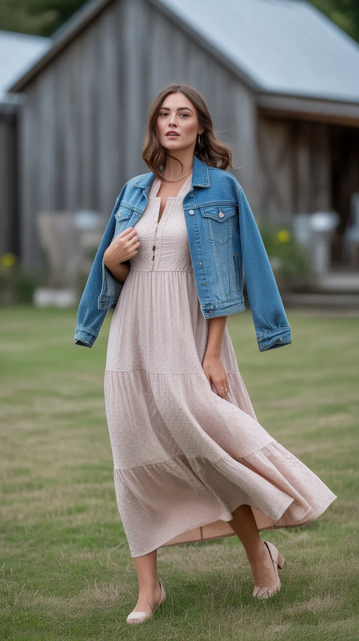 Pairing a dressy country outfit with a denim jacket is a smart move. It balances elegance with comfort, allowing you to enjoy the festivities without feeling overdressed. This combination is ideal for barn wedding guests who want to blend style with a laid-back feel.