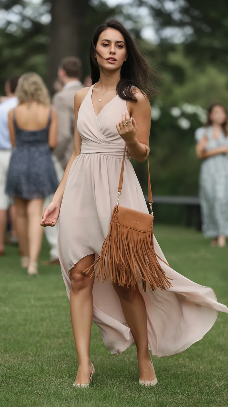 The dress is paired with a trendy fringe bag, adding a touch of boho flair. This accessory not only complements the dress but also enhances the overall look, making it suitable for a barn wedding or any outdoor celebration. The earthy tones of the bag harmonize beautifully with the dress, creating a cohesive outfit.
