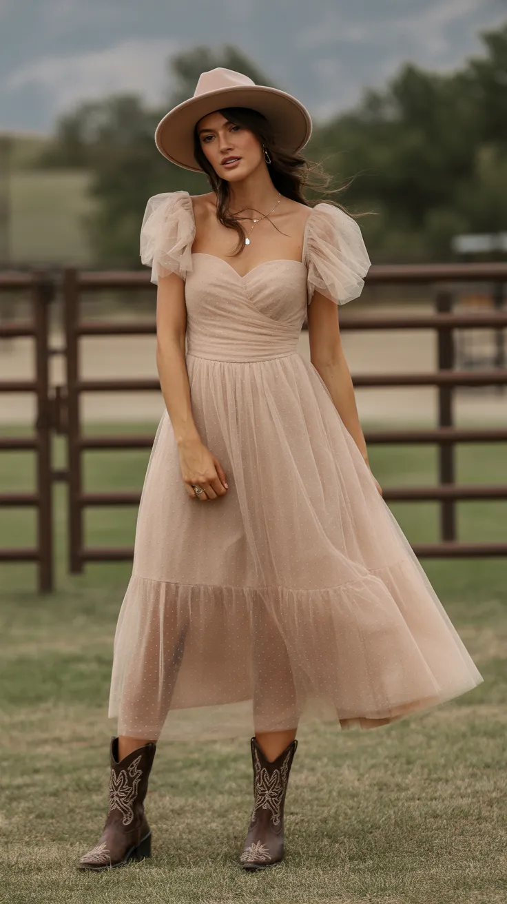 7. Tulle Country Wedding Guest Dress With Boots And Hat
