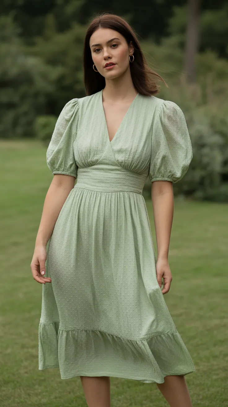 The soft green color evokes a sense of nature, fitting seamlessly into outdoor settings. The puff sleeves add a playful element, giving the dress a modern twist while keeping it classy.