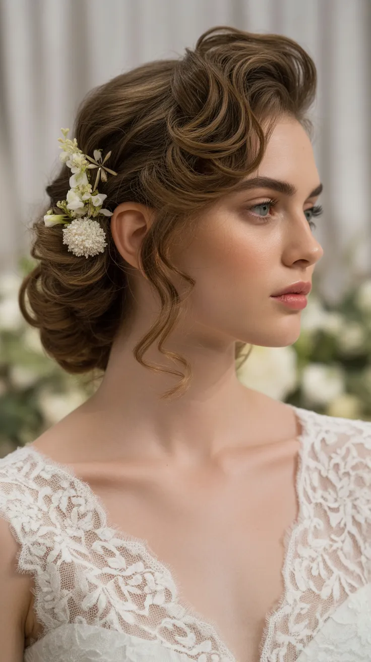 1. Sculpted Side-Part Curly Updo With Floral Pins