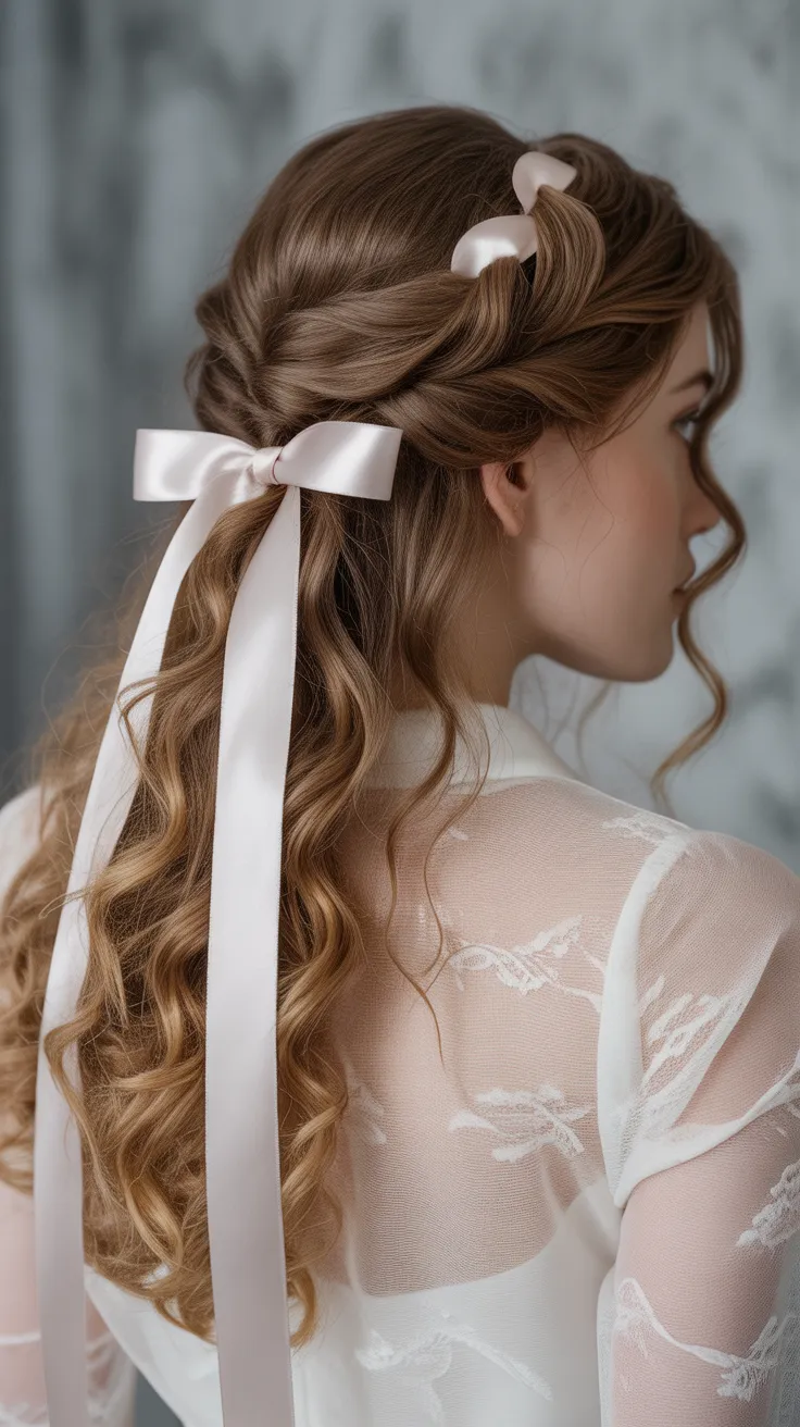 10. Cascading Curly Half-Up Style With Ribbons