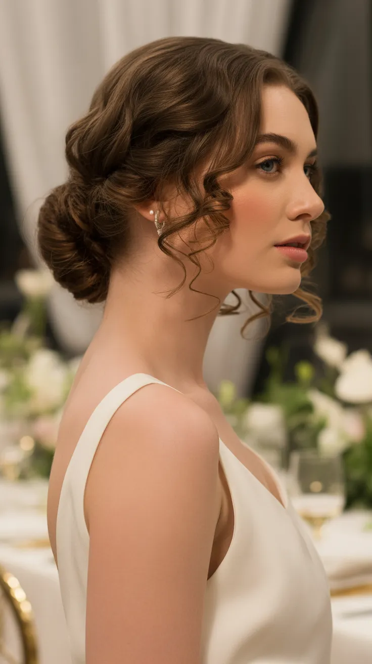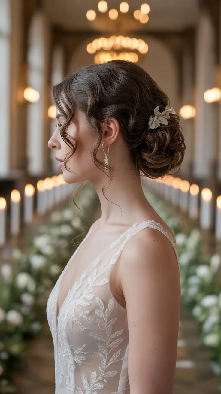 The low curly bun with side tendrils is a stunning choice for brides who want to showcase their natural curls while keeping things chic. This style combines elegance with a touch of playfulness, making it perfect for a romantic wedding setting.