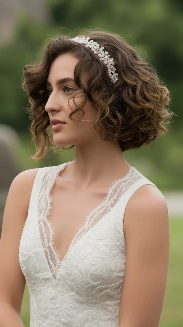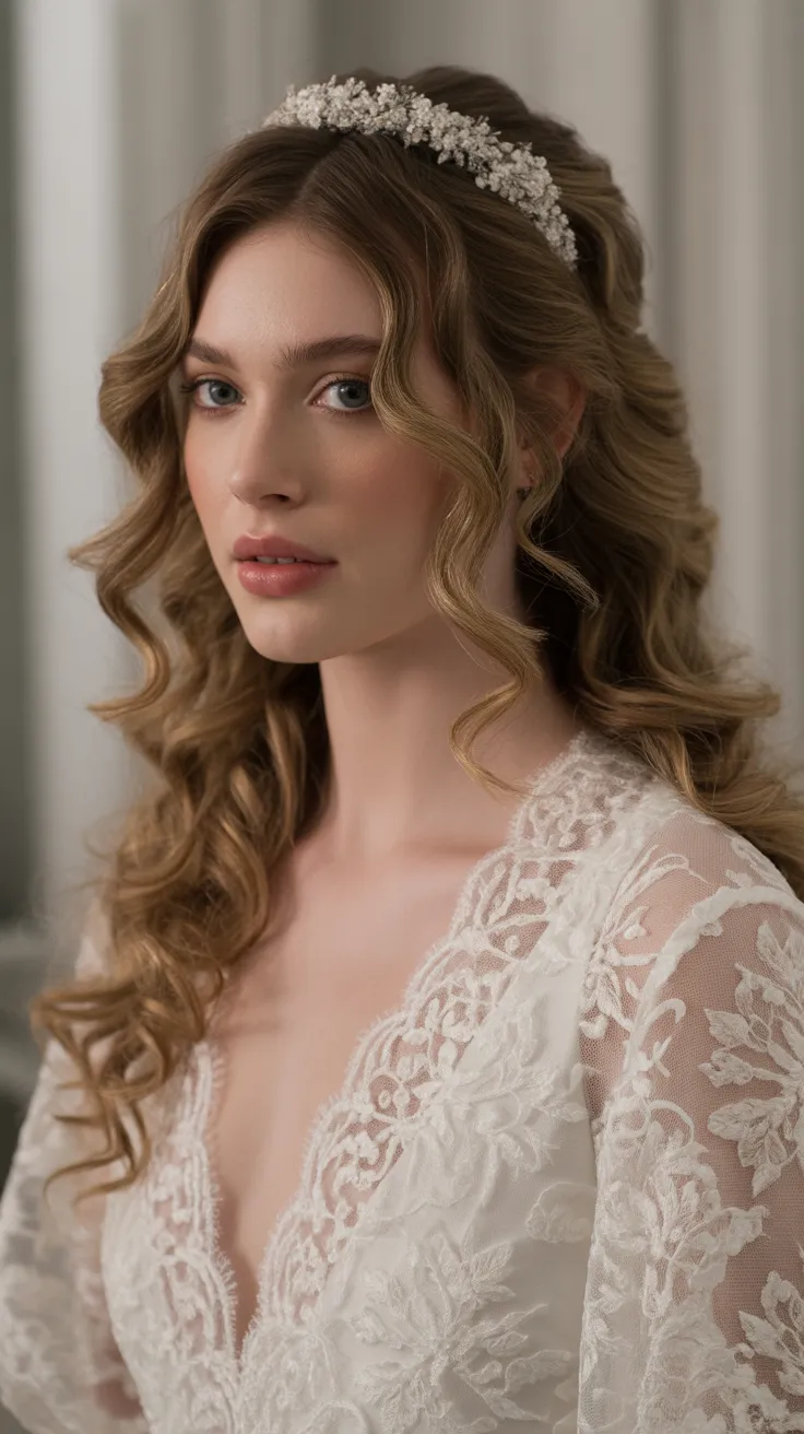 In this look, the side volume creates a soft and romantic feel. The curls frame the face beautifully, enhancing bridal elegance. Adding a headband elevates the style, bringing in a bit of sparkle that complements the overall look.