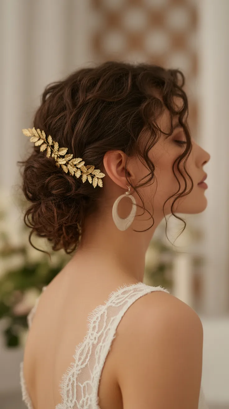 This style is ideal for brides who want to celebrate their curls while looking radiant on their special day. With the right accessories, like the gold leaf clip, you can elevate your curly hair wedding styles to new heights of glamour.
