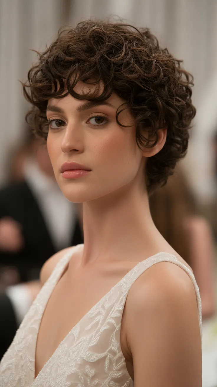 This tight curly pixie is a stunning choice for brides looking to showcase their natural curls. The glossy finish adds a touch of shine, making it perfect for a glamorous wedding. The curls are styled to frame the face beautifully, enhancing features and radiating confidence.