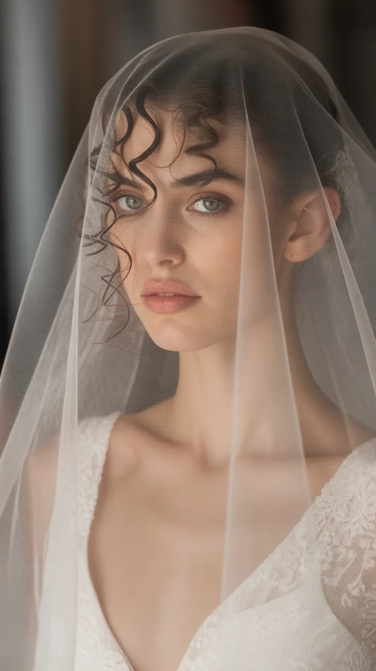 Defined spiral curls paired with a long veil create a stunning look for any bride. This style radiates bridal elegance, making it a perfect choice for a lush wedding. The curls frame the face beautifully, adding a touch of glamour to the overall appearance.