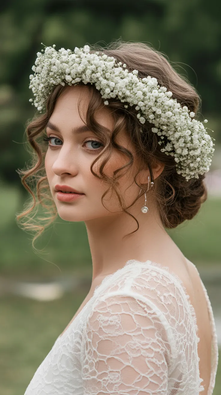 The halo crown of curls adorned with baby’s breath is a stunning choice for brides seeking a look that feels both effortless and glamorous. This style beautifully showcases natural curls, giving a soft and romantic vibe that complements any wedding theme.
