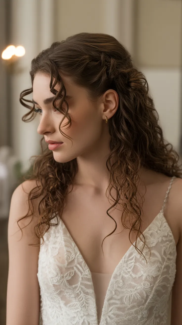 For those considering curly hair wedding styles, this half-up look is versatile. You can personalize it with accessories like floral clips or delicate pins, enhancing the overall aesthetic. Whether you’re going for a romantic vibe or something more modern, this hairstyle fits the bill perfectly.