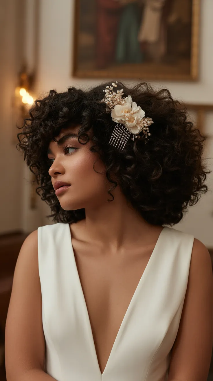 For those considering curly hair wedding styles, this look is both effortless and chic. It celebrates the beauty of natural curls while adding a unique flair with the floral details. Whether you’re going for a lush wedding or a more intimate gathering, this style will leave a lasting impression.