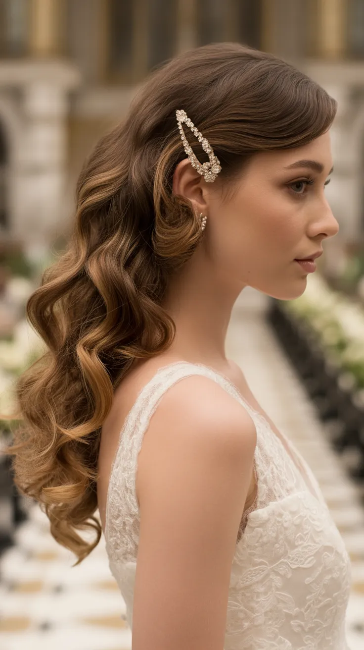 The addition of a rhinestone barrette elevates this look, adding a hint of sparkle that catches the light beautifully. This accessory not only enhances the overall style but also brings a sense of bridal elegance that is hard to resist. It’s a simple yet effective way to incorporate a bit of shine into your wedding hair.