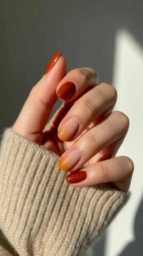 Pumpkin spice season isnβt just for lattes itβs perfect for your nails too. This cozy ombre blends burnt orange into a soft nude base, giving a warm, seasonal gradient. It feels festive without being too loud, so you can easily wear it every day. Pair it with oversized sweaters and a steaming coffee for the full autumn vibe β. A must-try if you want autumn nails that feel trendy yet totally wearable.