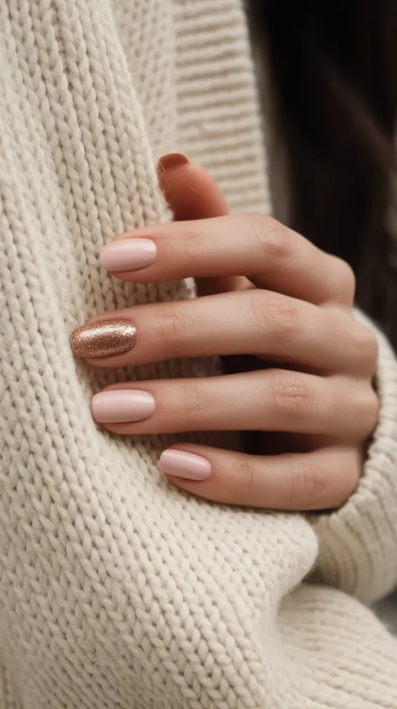 A nude manicure gets a fun seasonal upgrade with a copper glitter accent. Just one sparkling nail is enough to catch the light and give your manicure personality. Itβs the perfect way to add festive energy without committing to all-over glitter. Wear it to fall parties or just to brighten up your everyday look. β¨ Cute, trendy, and so easy to pull off.