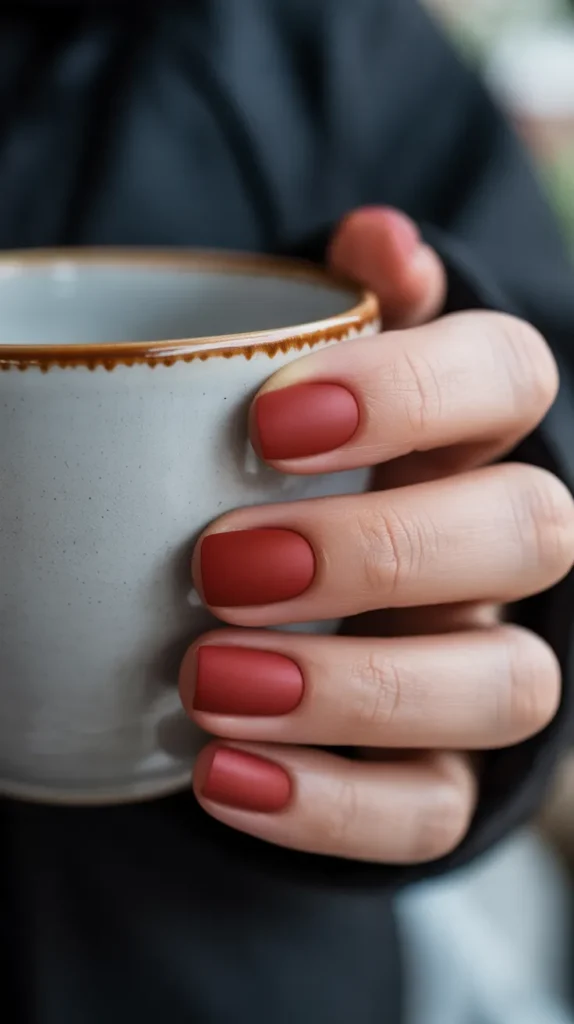 Rust red nails instantly bring that cozy fall vibe to your fingertips. The matte finish makes the shade feel even softer and more seasonal. Itβs bold but wearable, giving you the best of both worlds. Perfect for casual weekends, coffee dates, or even holiday dinners. This shade is a total autumn staple. π·