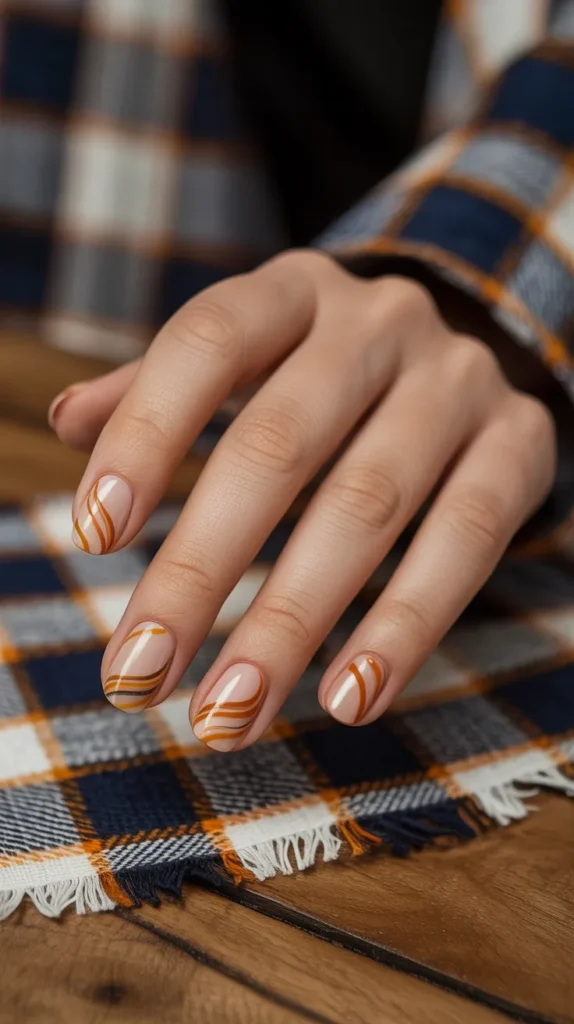 If you love playful designs, swirls are the way to go. Nude nails decorated with thin orange and caramel swirls feel fresh, artsy, and fun. The colors are perfect for autumn, giving your manicure a cozy seasonal feel. Plus, itβs a great conversation starter people always ask about swirl designs. π Trendy, cute, and full of personality.