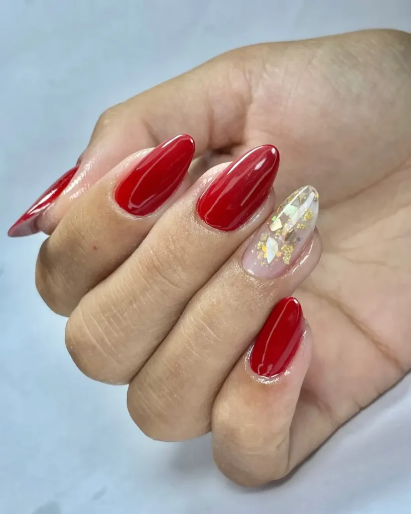 This manicure showcases rich, glossy deep red nails in a sleek almond shape, paired with a single accent nail featuring delicate gold foil. The clean finish and high shine give these nails a polished, upscale look that feels timeless and confident. Ideal for anyone who loves deep red nails designs that stay simple yet luxurious.
