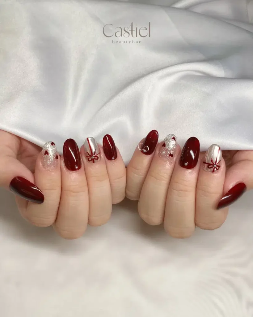 These deep red nails bring a festive edge with delicate silver accents and subtle sparkle. The combination of rich red tones and metallic details creates a holiday-ready manicure that still feels classy and wearable. Perfect for winter events or red Christmas nails that stay refined instead of overdone.
