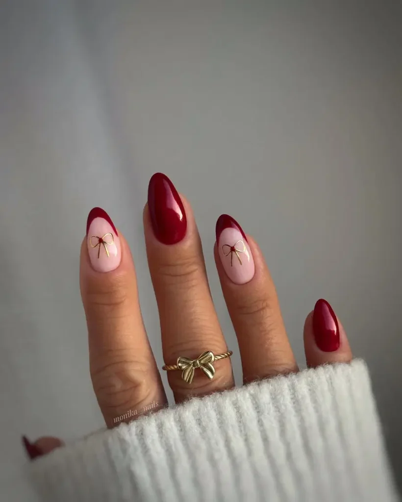 This manicure mixes deep red nails with soft nude accents decorated with delicate gold bows and festive embellishments. The combination feels elegant rather than overdone, making it a beautiful option for red Christmas nails that still look polished and wearable. A perfect choice if you love detailed designs with a classy, seasonal touch.