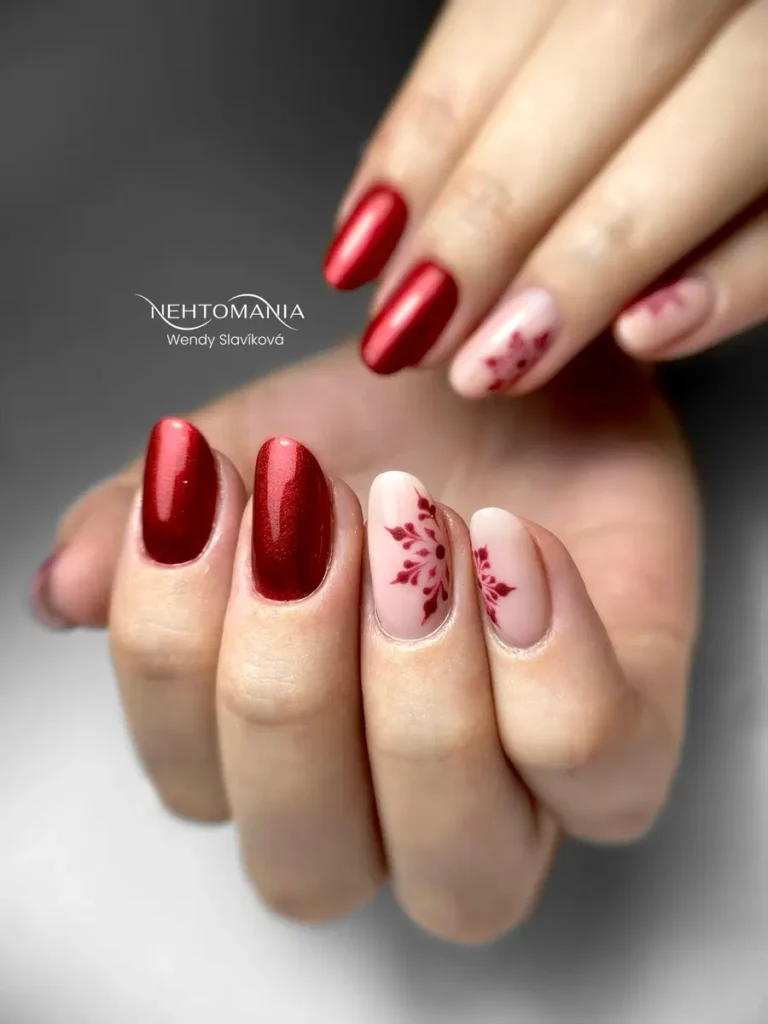 Bold deep red nails are paired with soft nude bases and delicate festive art accents for a refined seasonal look. The balance between solid red and detailed design keeps this manicure classy while still adding visual interest. It’s a great example of classy nails that feel festive, feminine, and wearable for everyday winter styling.