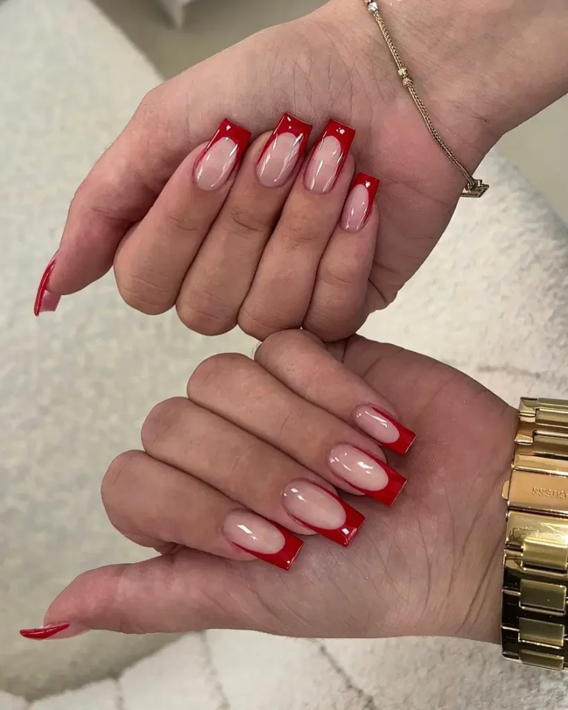 This manicure features deep red nails layered over a soft pink base, finished with smooth, glossy French-style accents. The look feels clean, modern, and effortlessly classy, perfect for anyone who prefers deep red nails with a softer, more refined finish.