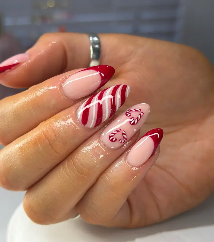 This deep red manicure blends rich glossy polish with playful holiday-inspired details. The bold red base is balanced by soft nude accent nails featuring candy cane stripes and festive motifs, creating a look that feels seasonal yet polished. It’s a great option for red Christmas nails that still maintain a classy, wearable finish without feeling overdone.
