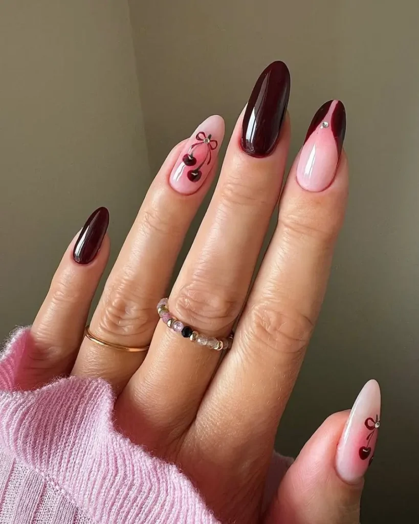 13. Deep Burgundy Almond Nails With Soft Heart Accent