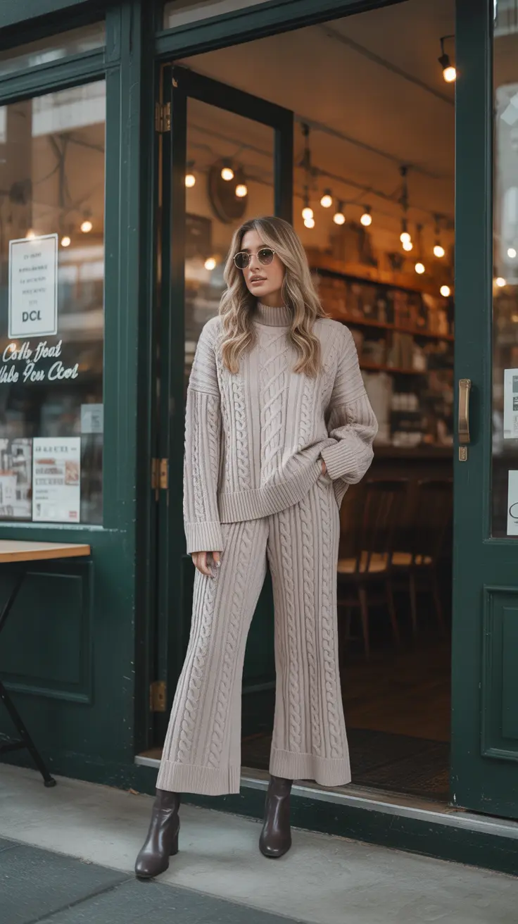 Adding ankle boots to this outfit brings a trendy edge. Ankle boots are a staple in fall outfits with boots, and they complement the knit set beautifully. The sleek design of the boots balances the texture of the knit, creating a polished look.