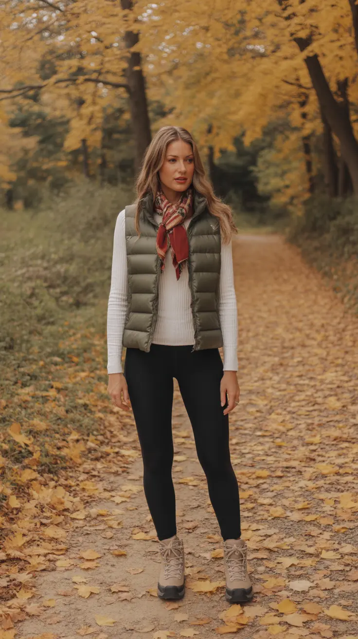 Leggings paired with hiking boots create a perfect blend of comfort and style for fall. This outfit is ideal for those crisp autumn days when you want to feel cozy yet chic. The model showcases a sleek look with black leggings that hug the body, making them a versatile choice for various activities.
