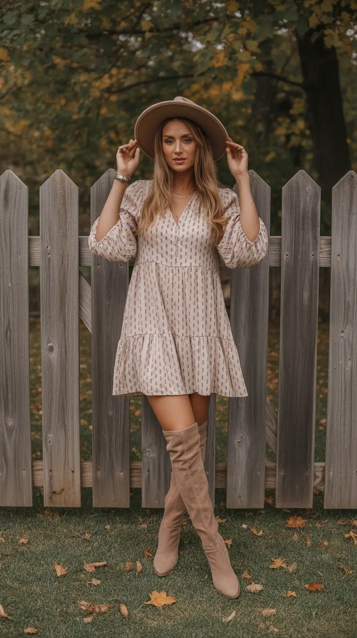 Combining a flowy dress with over-the-knee boots is a fantastic way to blend comfort and style this fall. The dress, adorned with vibrant floral patterns, brings a touch of warmth and femininity to your look. The soft fabric flows beautifully, making it perfect for those crisp autumn days.