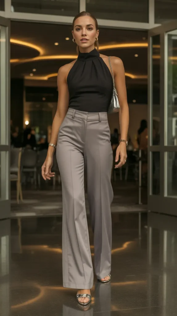 15. Grey Wide Flares with a Black Halter Neck Top