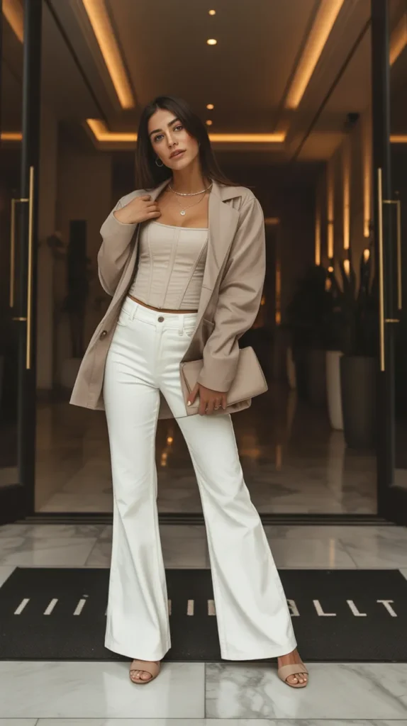 3. White Flare Pants with a Beige Corset Top