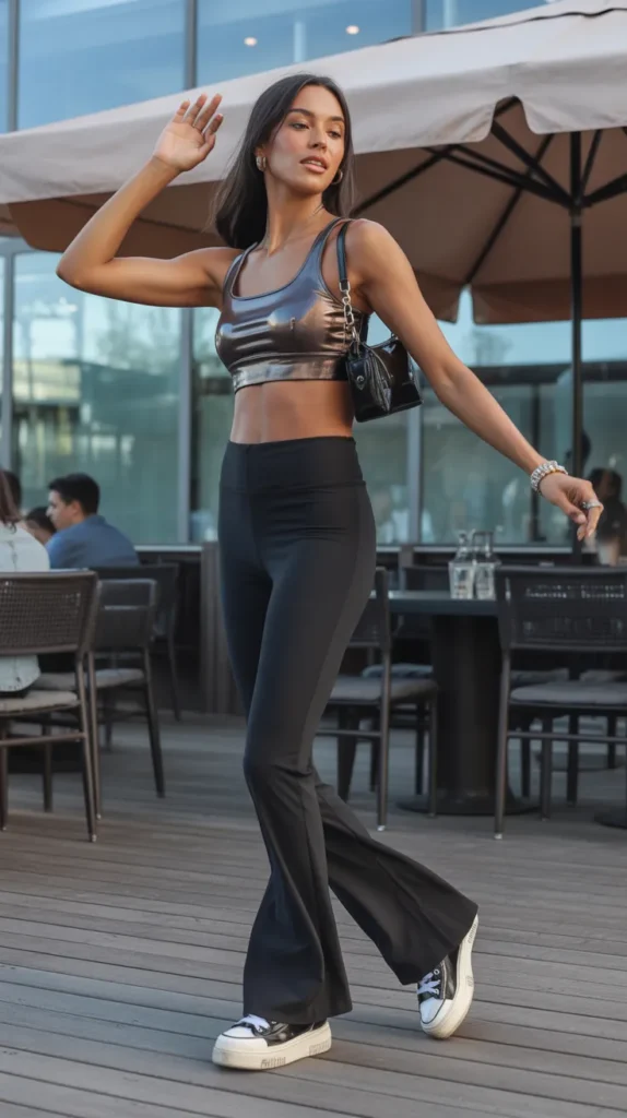 A sporty-glam mix that’s perfect for casual going-out plans. The metallic top adds shine while the yoga-flare base keeps everything comfortable. Platform sneakers bring a trendy, easygoing finish.