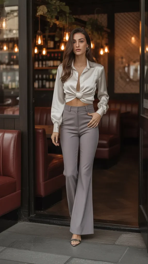 6. Grey High-Waist Flare Pants with a Satin Button-Up