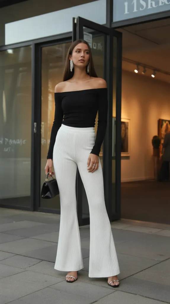 7. White Knit Flare Pants with an Off-Shoulder Black Top