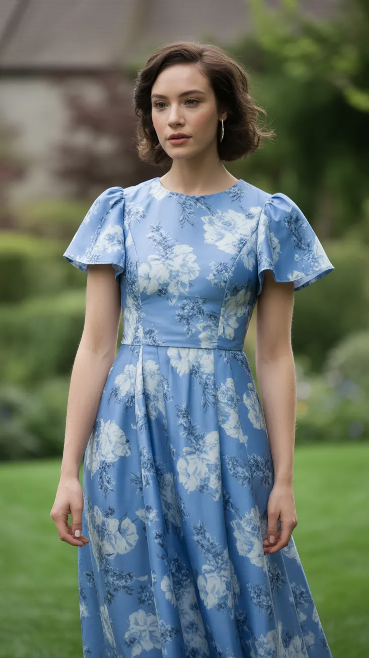 This blue floral garden party dress is a charming choice for any wedding guest. The soft blue fabric features delicate floral patterns that add a fresh touch, making it perfect for an English garden wedding guest outfit.