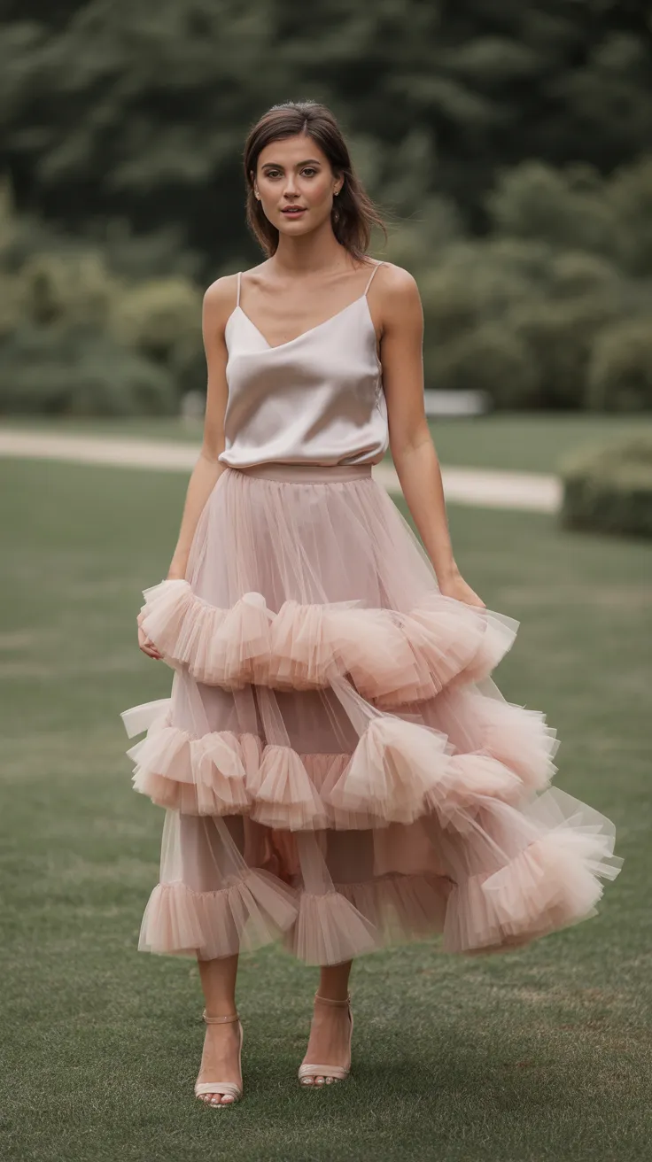 The blush tulle skirt paired with a silk cami top is a stunning choice for a garden party wedding. This outfit strikes a perfect balance between playful and sophisticated. The soft pink hue of the skirt adds a romantic touch, making it an ideal fit for an English garden wedding guest outfit.