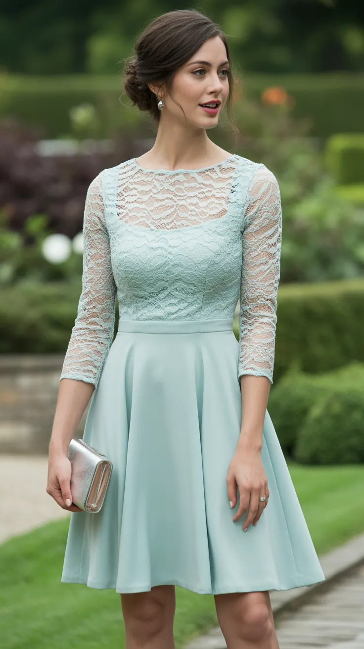 This mint green fit-and-flare dress is a stunning choice for a garden party wedding. The delicate lace overlay adds a touch of charm, making it perfect for an English garden wedding guest outfit. The soft hue complements the natural surroundings beautifully, creating a fresh and effortless look.